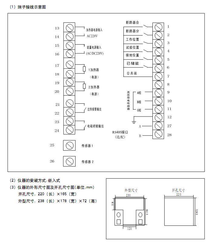 功能描述:柜內(nèi)溫濕度數(shù)碼管顯示及控制、動(dòng)態(tài)模擬顯示圖、語音防誤提示、高壓帶電顯示及閉鎖、遠(yuǎn)方/就地操作、照明操作、分/合閘指示、儲能指示、預(yù)分預(yù)合閃光指示和RS-485通訊接口。