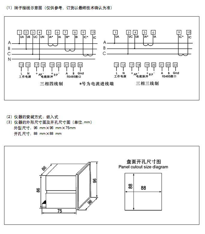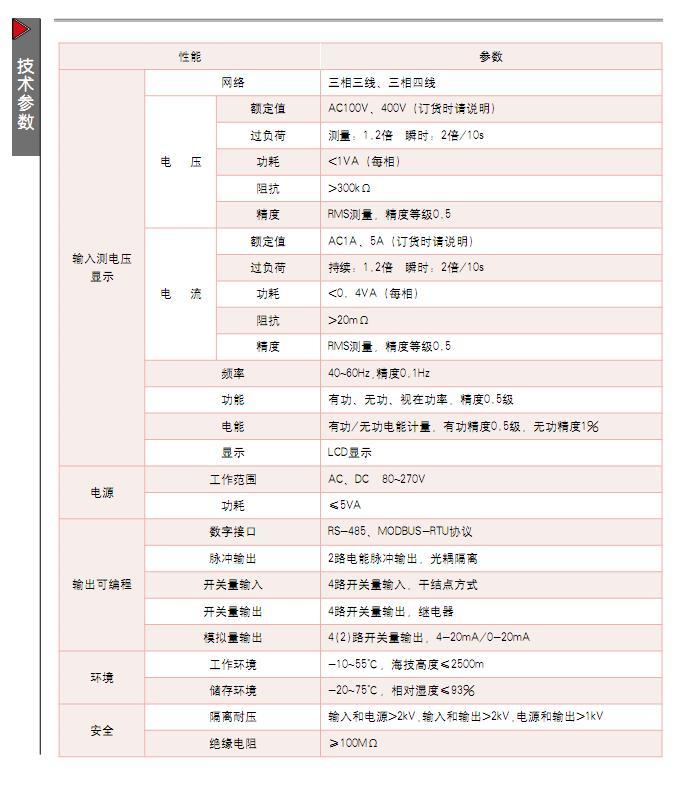 而設(shè)計的。它能高精度的測量所有常用的電力參數(shù),如三相電壓、三相電流、有功功率、無功功率、頻率、 功率因數(shù)、四象限電能等;采用可視度高的LED來顯示儀表測量參數(shù)和電網(wǎng)系統(tǒng)的運行信息,儀表面板帶有 四個編程按鍵,用戶可現(xiàn)場方便的實現(xiàn)顯示切換、儀表參數(shù)編程設(shè)置,具有很強的靈活性。